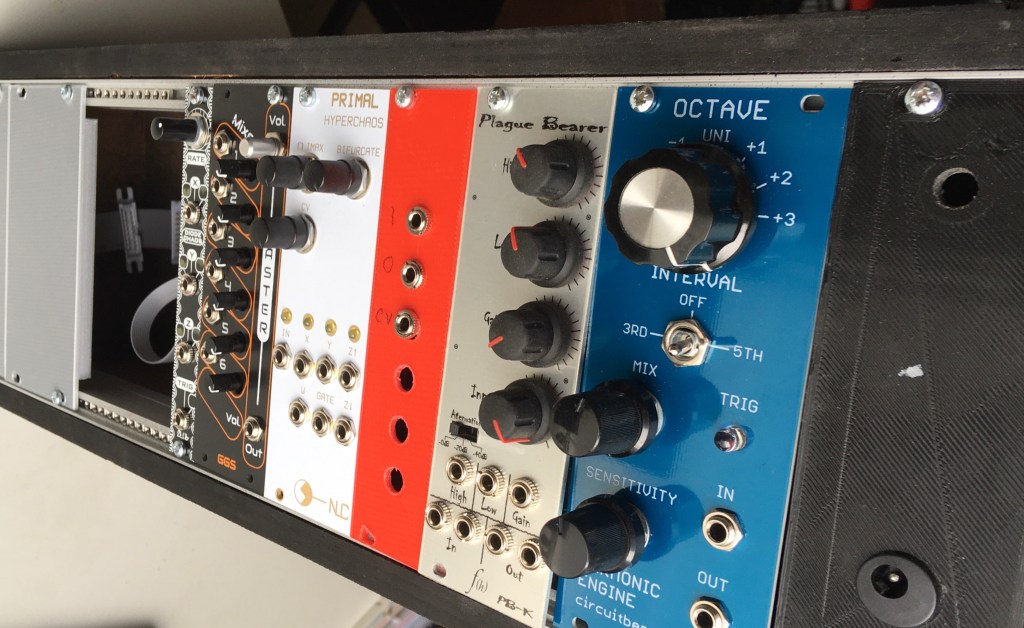 A laser-cut case for Drone v& Drama v2 and a 84HP eurorack skiff are available for download.