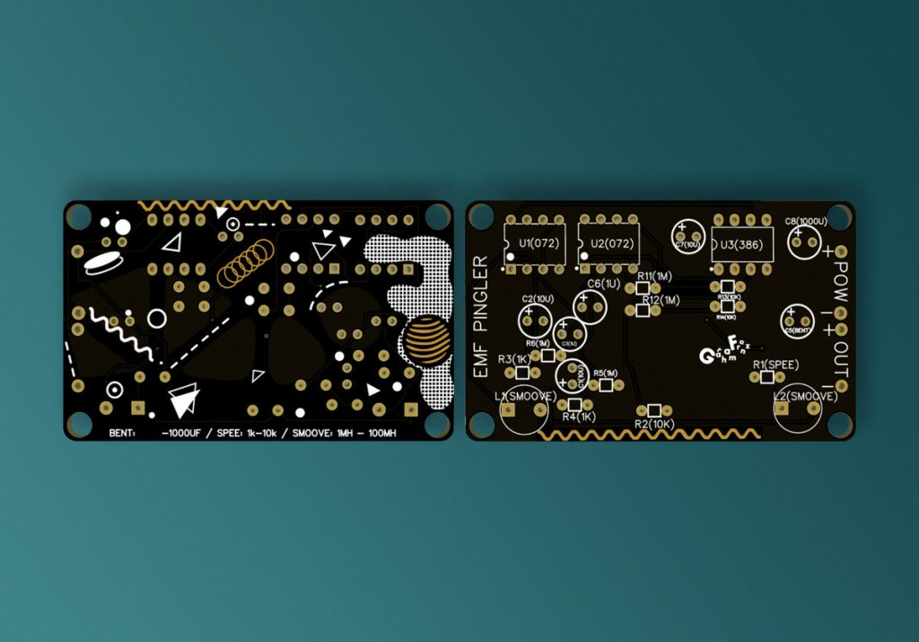 Included is a DIY PCB of the EMF Pingler, a detector of invisible signals and ghosts. A noise device that picks up on its environment and makes sound when it is passed through electromagnetic fields (EMFs). The PCB itself features beautiful designs that make it a worthwhile trinket for those who may not want to solder.