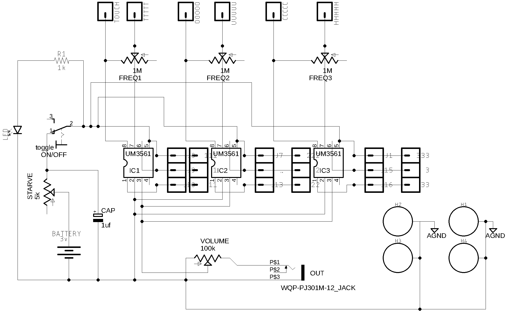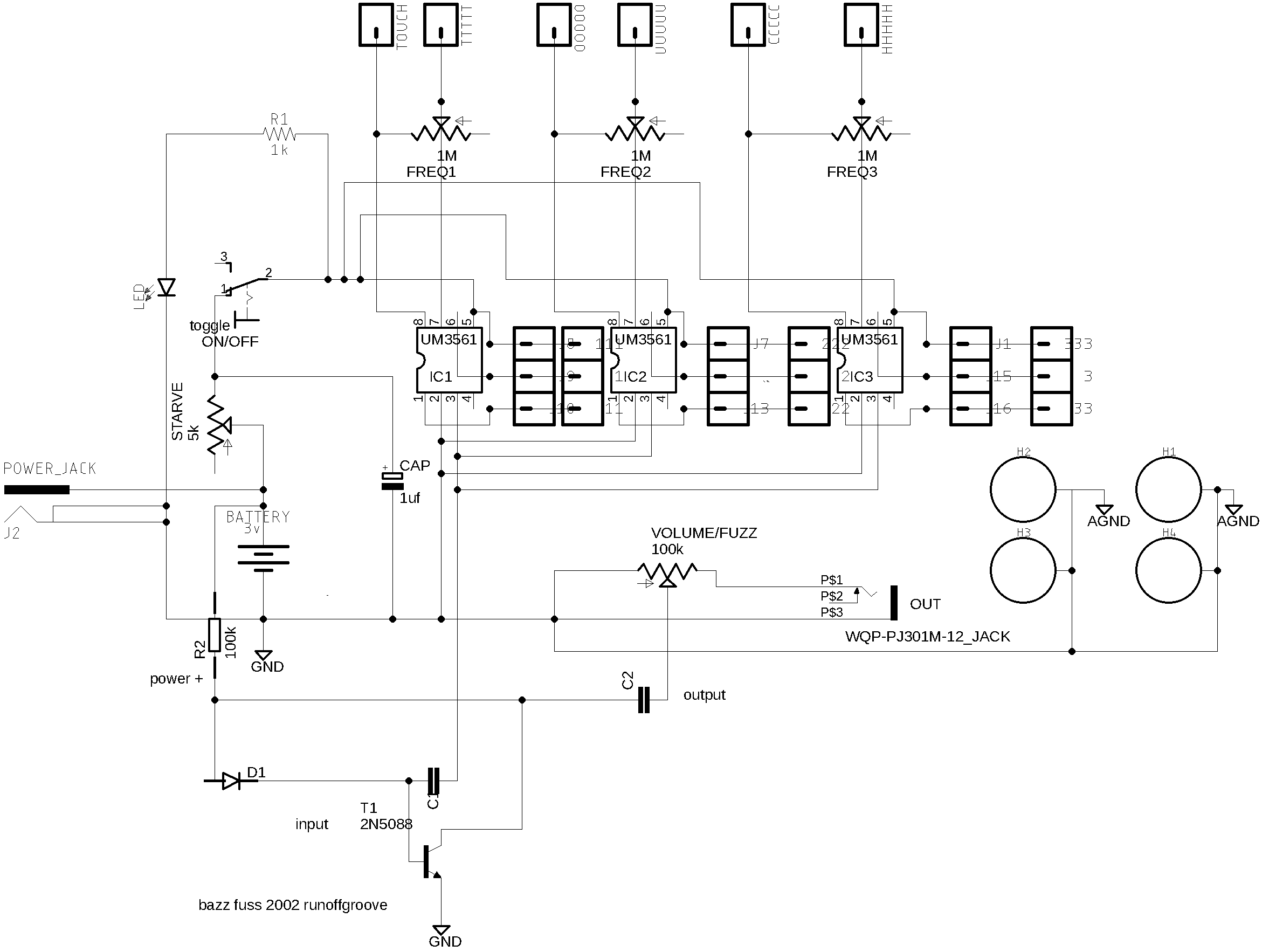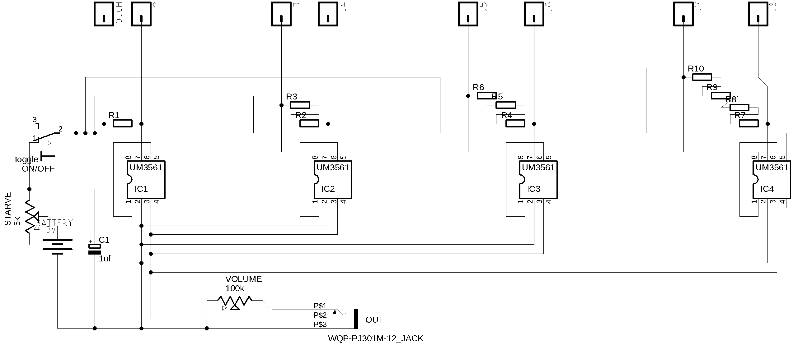 This circuit has an output volume control, power starve and touch points connected to the resistors.